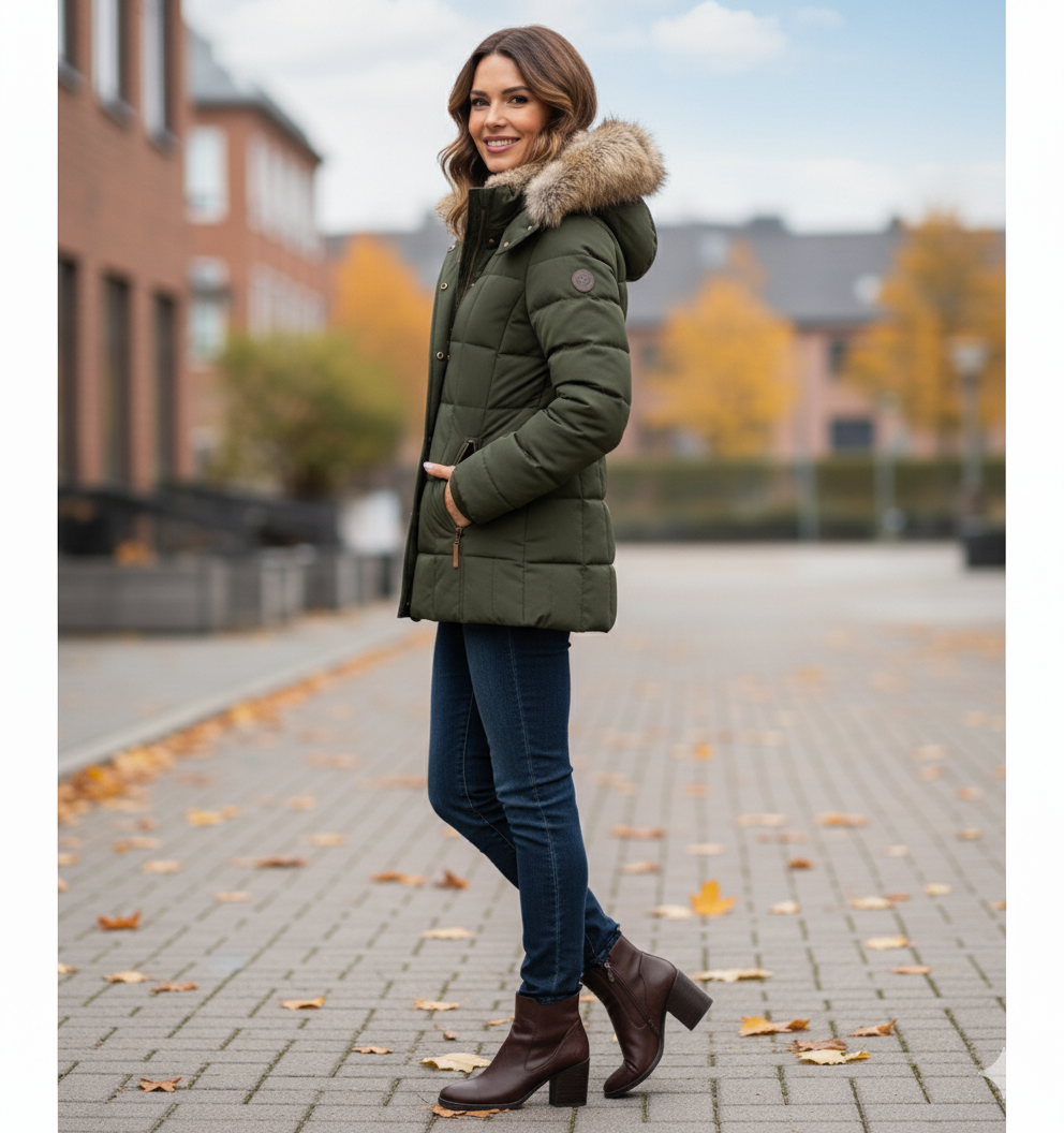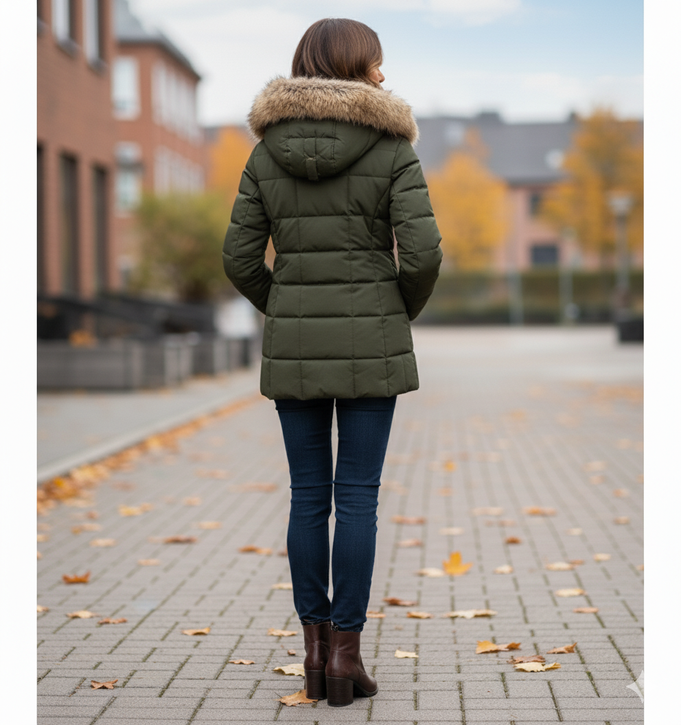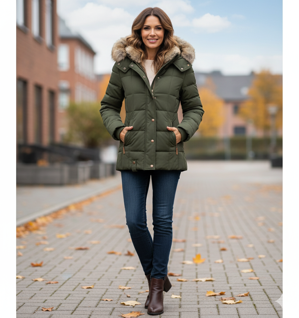 No dejes que el frío te detenga. Nuestro plumífero verde militar con capucha de pelo es la combinación ideal de moda, calidez y confort. Diseñado para la mujer moderna que busca protección sin renunciar a la elegancia, te mantendrá abrigada y fabulosa en cualquier ocasión.